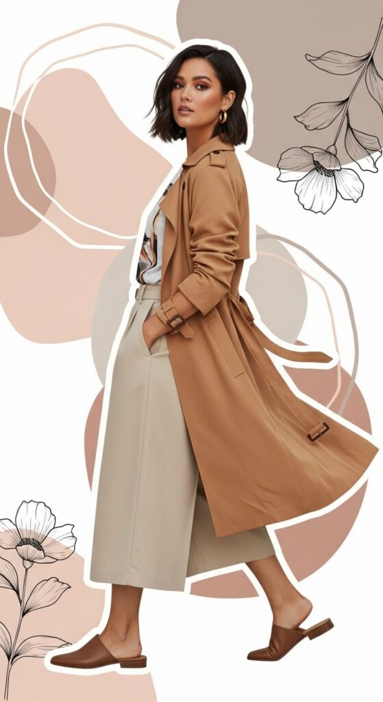 A classic trench coat brings structure and elegance to creative staples like culottes, graphic tees, or paperbag trousers. Its timeless silhouette anchors the outfit, allowing playful pieces to shine without feeling chaotic.