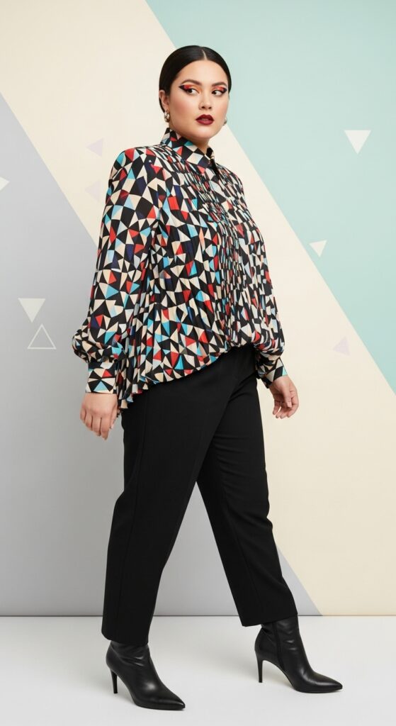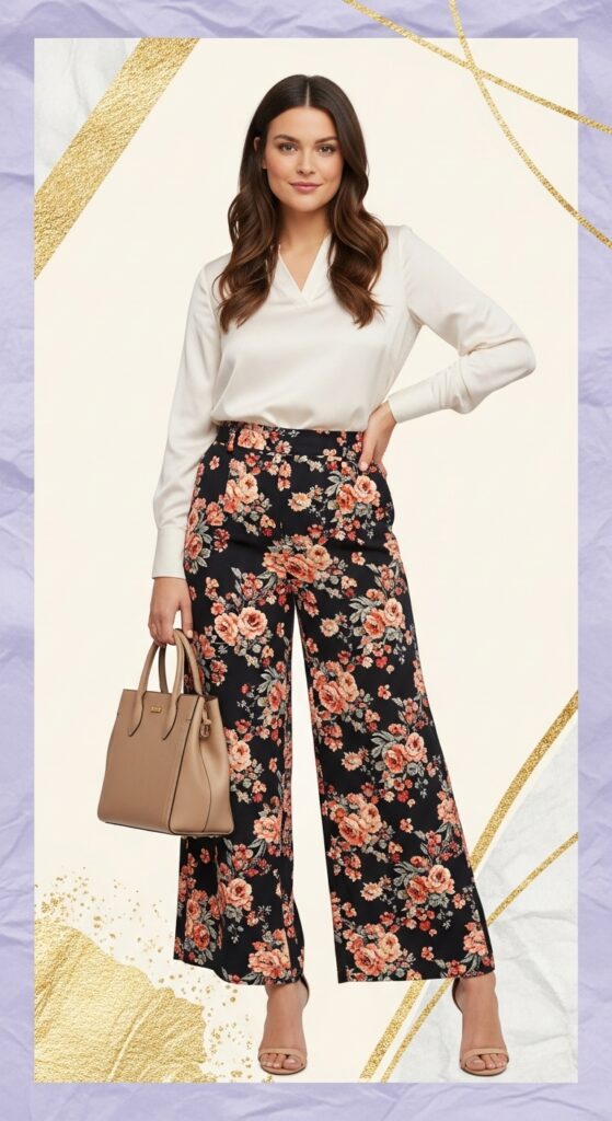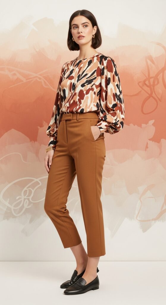 A printed blouse tucked into pleated trousers brings color and personality to the office. Bold patterns, florals, or abstract prints catch the eye, while the tailored trousers keep things grounded.