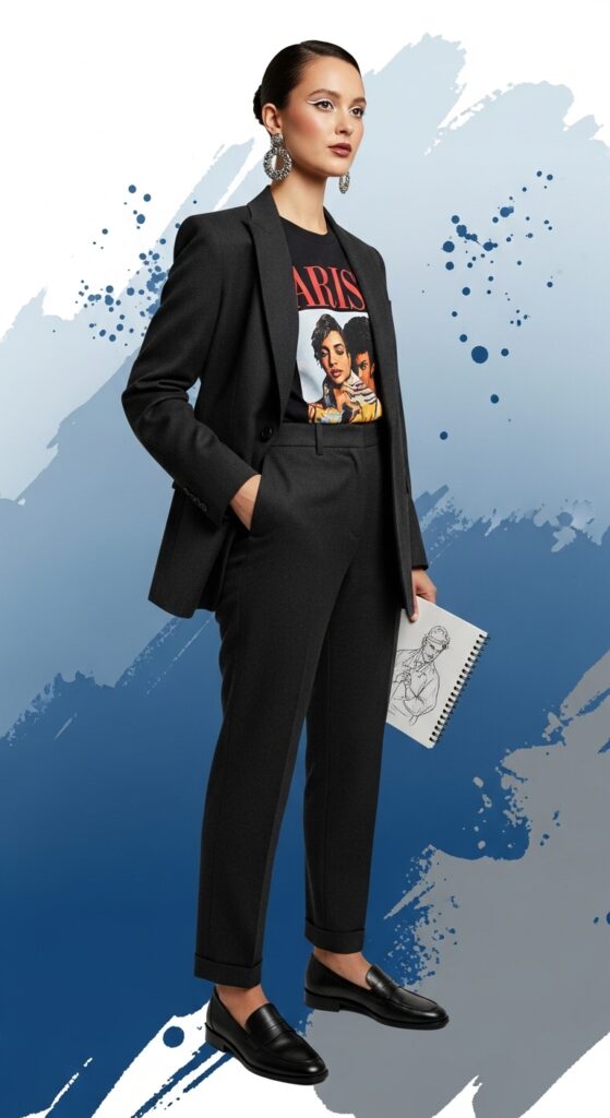 A graphic tee tucked beneath a classic suit brings playful rebellion to the office. The juxtaposition of casual and formal elements makes the look unique and approachable, sparking conversation without breaking dress codes.