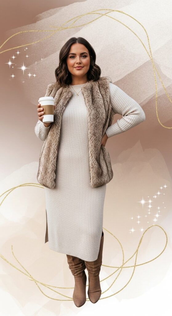 A faux fur vest layered over a fitted knit dress brings tactile intrigue and cozy comfort to the office. Neutral tones like ivory or camel keep the look grounded, while the vest adds texture and dimension.
