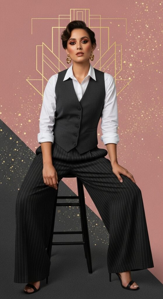 A tailored vest layered over a crisp shirt and classic trousers creates a vintage-inspired yet modern look. This ensemble nods to tradition while still feeling fresh and contemporary.