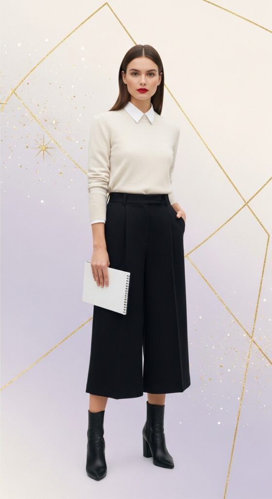 Culottes offer freedom of movement and a modern silhouette, making them a favorite for creative workspaces. When paired with a fitted sweater, the overall effect is sleek and intentional.