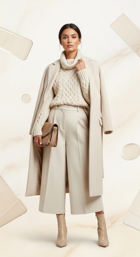Texture is key to keeping monochrome outfits visually interesting. Ribbed knits, silk camisoles, and wool jackets work together to add dimension. Shoes in a similar tone complete the look, creating a sleek, elongated silhouette.