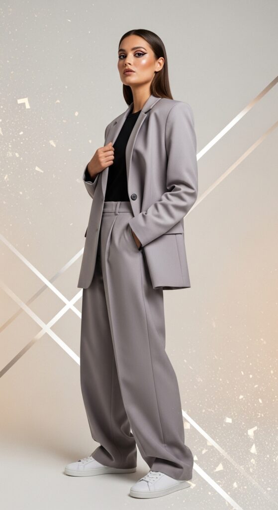 A soft, draped suit worn with chunky sneakers bridges the gap between tailored polish and creative cool. The relaxed fit of the suit offers comfort, while the sneakers lend a modern, approachable edge. Subtle colors like dove gray or olive feel right for both office and after hours.