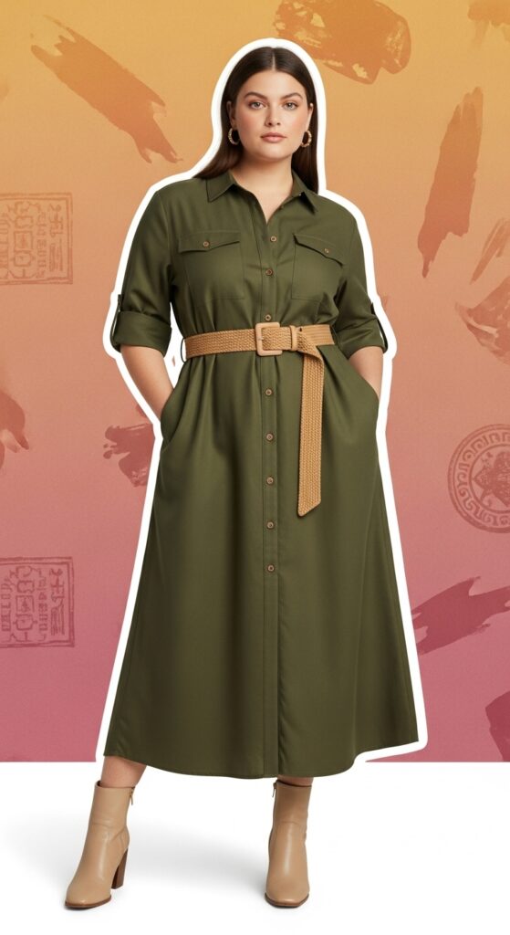 Shirt dresses in breathable fabrics transition well across seasons. Worn with flats in spring or boots in fall, this outfit feels fresh and modern year-round. A statement bag or chunky necklace completes the look.