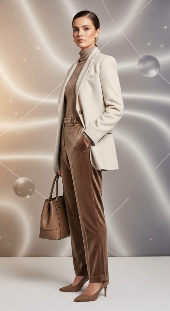 Shoes and bags in coordinating materials—like suede loafers or a pebbled leather tote—complete the ensemble, underscoring the attention to detail that creative professionals value.