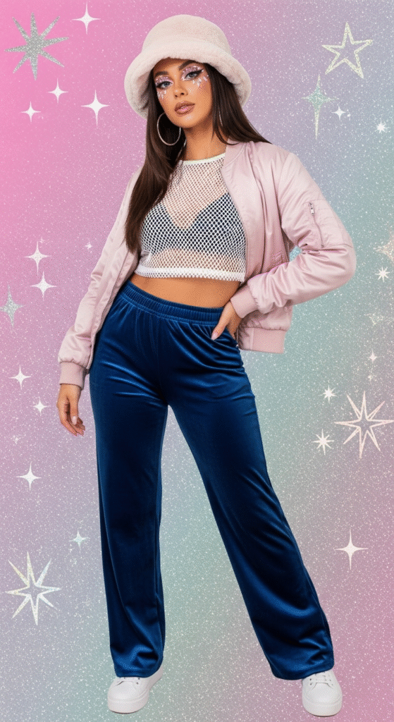 Touch is a language all its own, and both Barbiecore and Y2K speak it fluently. Textures play a starring role: fuzzy angora sweaters, glossy vinyl bags, mesh tees, sequined pants, and soft velour track jackets. Every piece invites you to reach out, remember, and imagine.