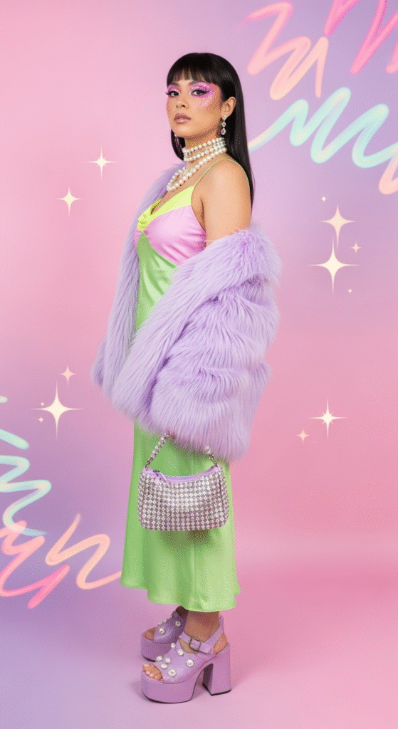 These tactile details do more than look good—they connect us with the past. A faux fur stole calls up childhood dress-up games, while a sparkly mesh top feels futuristic, almost like dressing up for a party that hasn’t happened yet. The blend of soft and shiny, plush and slick, turns every outfit into an experience for the senses.